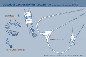 Ocean zones where phytoplankton (diatoms, flagellates, etc.) will proliferate are usually the zones where the nutriments are found close to the surface where light can penetrate (shallow waters or else deep waters where upwellings bring the nutriments to the surface).