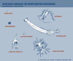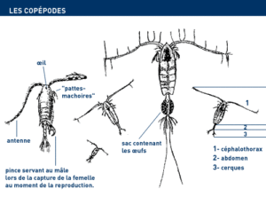 It is estimated that every litre of seawater contains between 1 and 10 copepods. These minute crustaceans have a body like a grain of rice, legs shaped like oars, sometimes a fairly well developed eye (more like a telescope that a human eye) and outsize feelers.