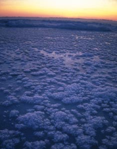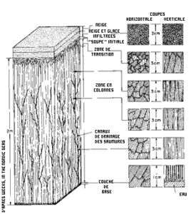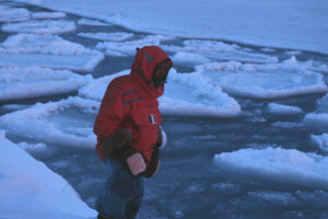 The nature of the first ice depends on the state of the sea. In calm weather, large needle-shaped crystals align parallel to each other and form a 1 to 2 cm thick layer on the surface (an icy ‘soup’). If the sea is rough, small crystals develop in all directions, sometimes up to a meter deep, forming a thick viscous layer: frazil ice. Only then does freezing begin on the surface. This freezing process can last from 9 to 36 days.