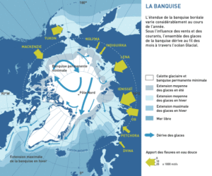 In the heart of winter, sea ice extends over nearly 15 million km², of which almost half will melt during the summer. The remaining portion will persist for 2, 3, 4 years or more, and its thickness will then reach 4 to 5 meters. During this time, this ice crust will traverse the Arctic Ocean, carried by currents: this is the Arctic drift.