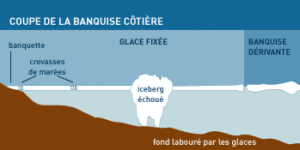 Near the coasts, sea ice is also shaped by tides, freshwater inputs, coastal currents, and exposure to wind or sun. A grounded ice foot, resting on the seabed, remains attached to the coast. This ‘shore ice’ can be thicker than the sea ice itself and anchor to the seabed; offshore, it extends as a band of ‘fast ice’ (in English fast ice), which can survive for more than 10 years. Sometimes, trapped icebergs are found there.