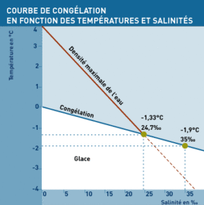 In the Arctic, sea surface salinity varies from 32 to 33 g/L (compared to an average of 35 for the global ocean). The first ice crystals form small lamellae 1 millimeter thick, and tiny brine droplets (about ten micrometers) are trapped within this crystalline network. Young sea ice thus traps up to 22 g/L of salts. Seawater also contains impurities and air bubbles, which are also trapped in the ice.