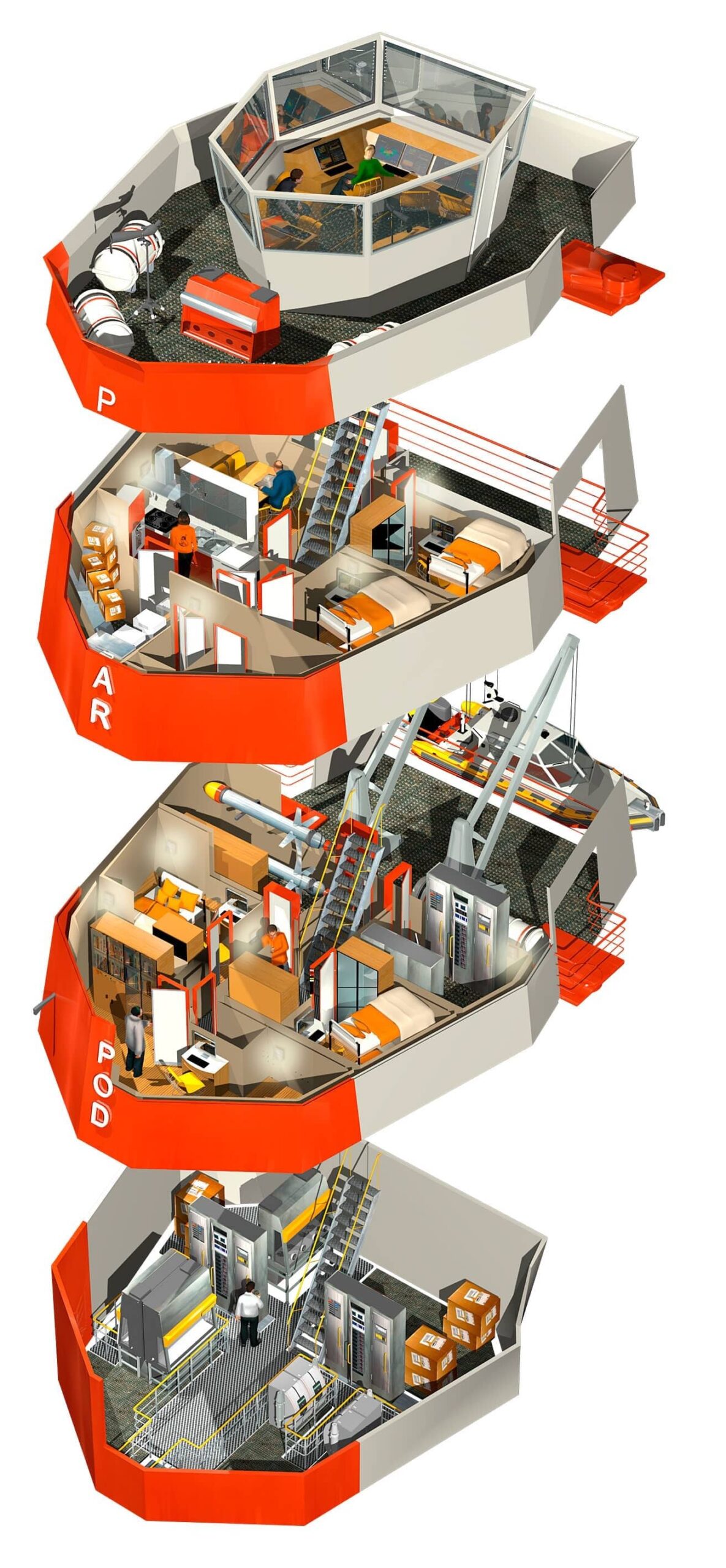 On the same principle, the Polar POD will be towed horizontally to the research zone and tilted vertically by filling ballast tanks with seawater.