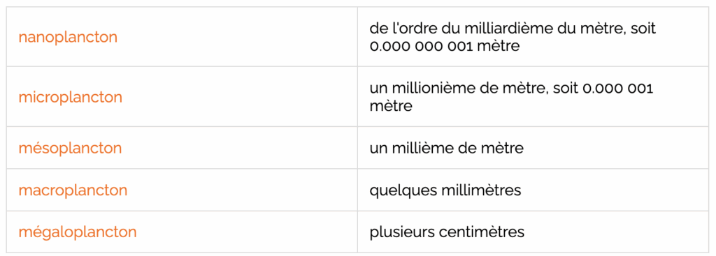 On peut classer les organismes planctoniques :