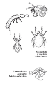 De petits invertébrés à cycle de reproduction rapide peuvent seuls tirer profit de l’été antarctique. La succession de tous les stades larvaires demande parfois plusieurs hivers. On rencontre des acariens, des nématodes, des tardigrades, des collemboles, des moucherons et des rotifères. Le géant de l’Antarctique est un moucheron sans ailes de 12 mm : Belgica antarctica. D’autres invertébrés vivent dans les lacs (crustacés copépodes) ; d’autres encore prolifèrent en parasites (poux, tiques, vers…) sur ou dans le corps des animaux supérieurs.