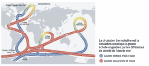 De même, l’Antarctique comme l’Arctique sont des régions responsables de la formation d’eau de fond, de l’eau dense et donc « lourde » qui se charge en sel près des zones de création de banquise. Cette eau plonge ensuite dans l’océan et alimente le moteur du grand tapis roulant que l’on appelle « la circulation thermohaline ». Le bon fonctionnement de cette circulation assure les échanges de chaleur et de sel dans l’océan mondial et donc une grande partie de notre climat régional. La plongée des eaux en Arctique est notamment un moteur du « Gulf Stream » donnant un climat plus chaud et clément à la latitude de Bordeaux en France, comparée à celle de Montréal.